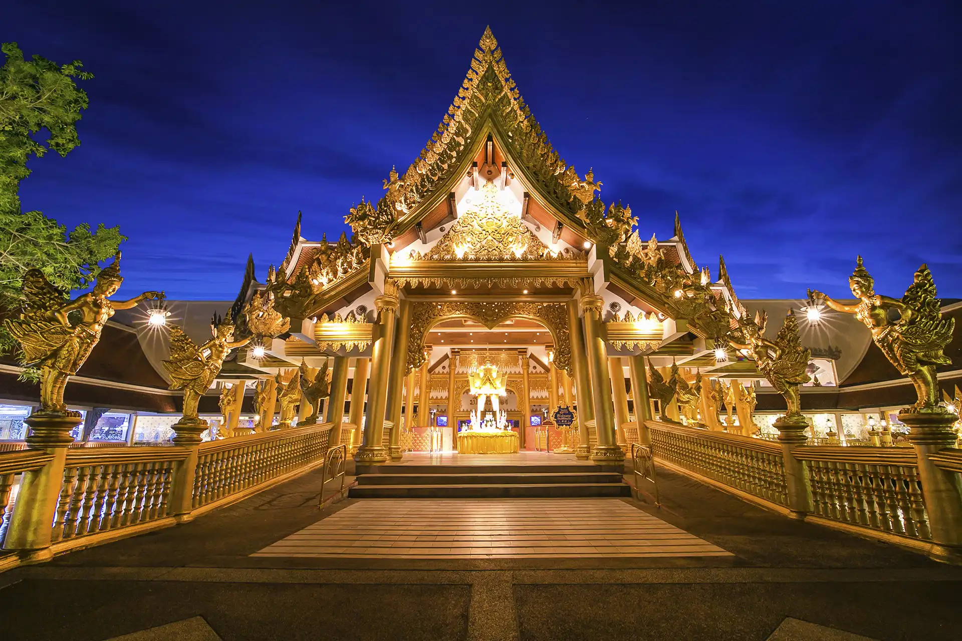 The park features a grand theater that hosts the award-winning show 'Fantasy of a Kingdom,' which showcases Thailand's rich heritage through stunning performances, elaborate costumes, and breathtaking special effects. Guests can also explore the beautifully landscaped grounds, which are adorned with traditional Thai architecture and exotic gardens. The park's ambiance is further enhanced by its lively atmosphere, with various attractions including games, shops, and dining options that reflect the local culture.