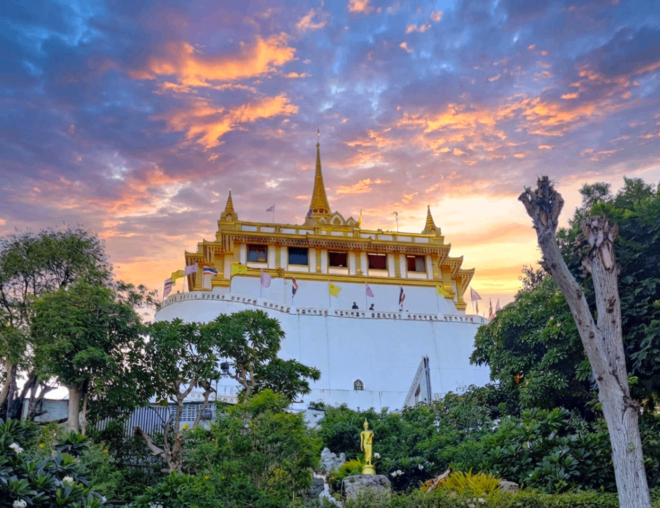 The Golden Mount Wat Saket in Bangkok is highly praised by visitors for its incredible panoramic views, serene atmosphere, and affordable entry fee of 100 baht. Reviewers consistently highlight the breathtaking views of the city, especially at sunset, which provides a magical golden hour experience. The temple's ambiance, with its ancient gongs, bells, and waterfalls, offers a unique spiritual and peaceful retreat from the bustling city below. Many visitors appreciate the well-maintained grounds and the availability of refreshments and clean restrooms, enhancing the overall experience.